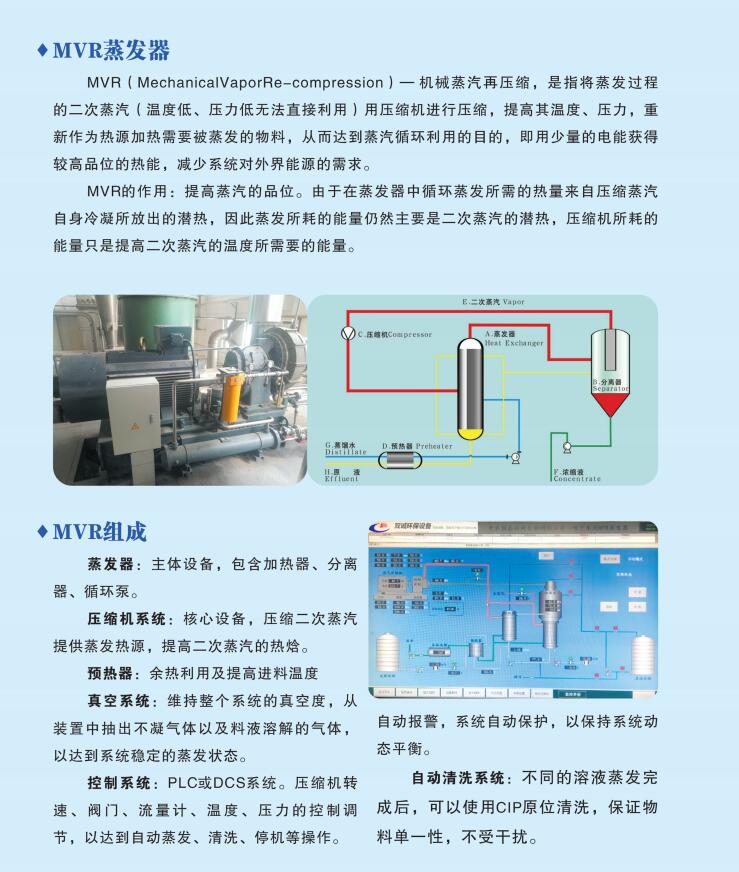 mvr蒸發器設備由加熱器、強制循環泵、蒸發分離器、結晶器、冷凝器、各種物料泵、冷凝水泵、真空泵、操作平臺、電器儀表控制柜及界內管道閥門等成。
